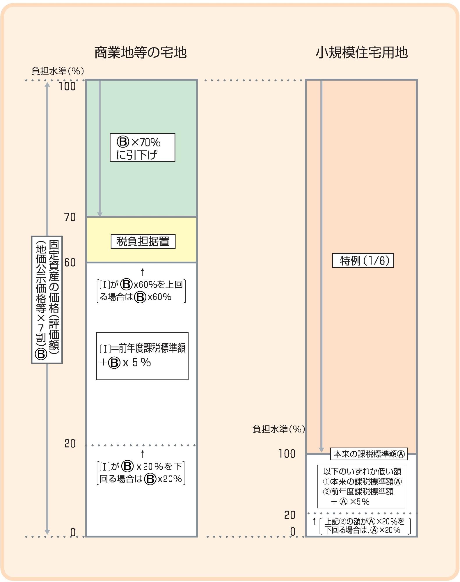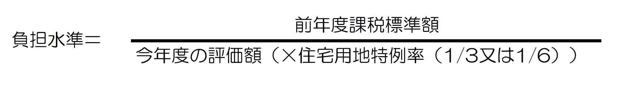平成9年度の評価替え以降、課税の公平の観点から、地域や土地によりばらつきのある負担水準(今年度の評価額に対する前年度課税標準額の割合)を均衡化させることを重視した税負担の調整措置が講じられ、宅地については負担水準の高い土地は税負担を引き下げ又は据置き、負担水準の低い土地はながらかに税負担を上昇させることによって負担水準のばらつきの幅を狭めていく仕組みが導入されています。