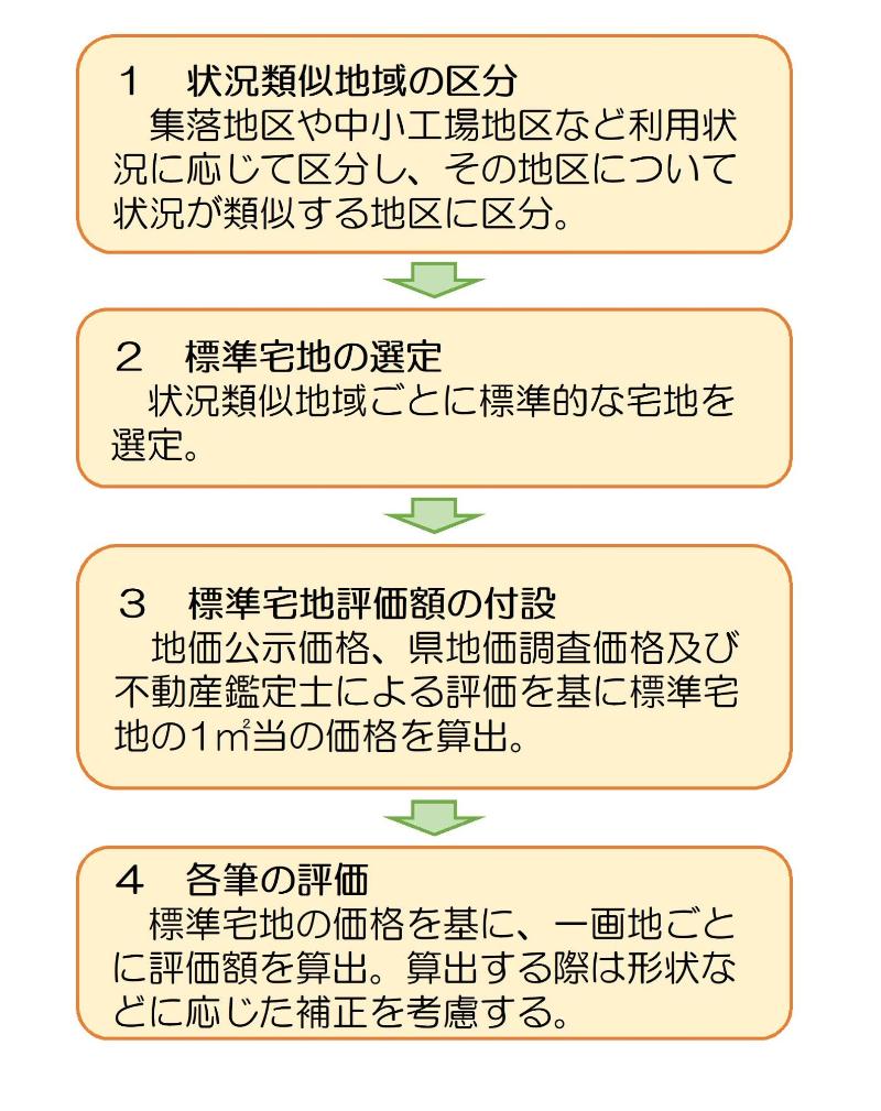 土地の評価は、総務大臣が定める固定資産評価基準に基づいて、売買実例価額から不正常な要因(売り急ぎ、買い急ぎ、投機的取引など)を除いた正常売買価額を求め、それを基礎として、地目別に定められた評価方法により評価を行うこととされています。